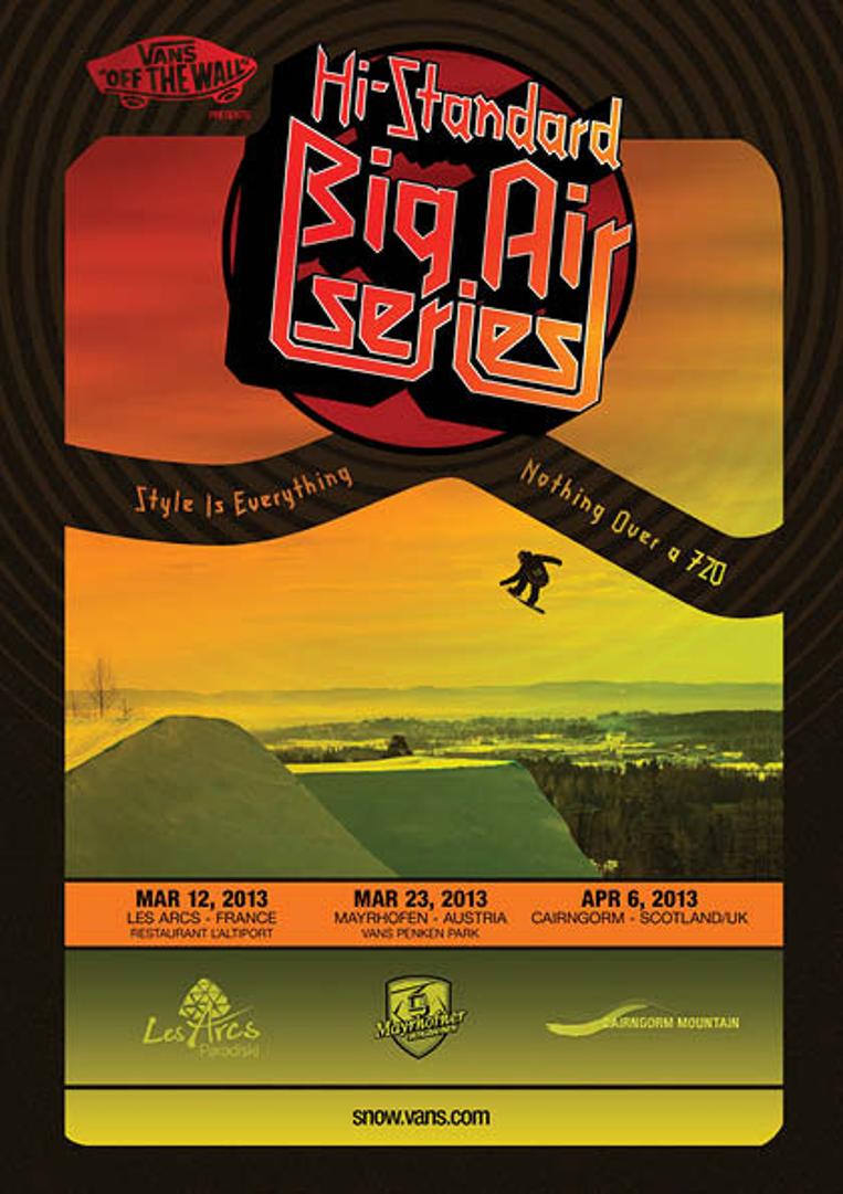 Vans is proud to introduce a new snowboard event: the Hi-Standard series. Events will take place in major European snowboard resorts and feature an original big air format where riders are judged on individual style, creativity and self-expression - the Vans way. Rotations over 720 are not permitted.